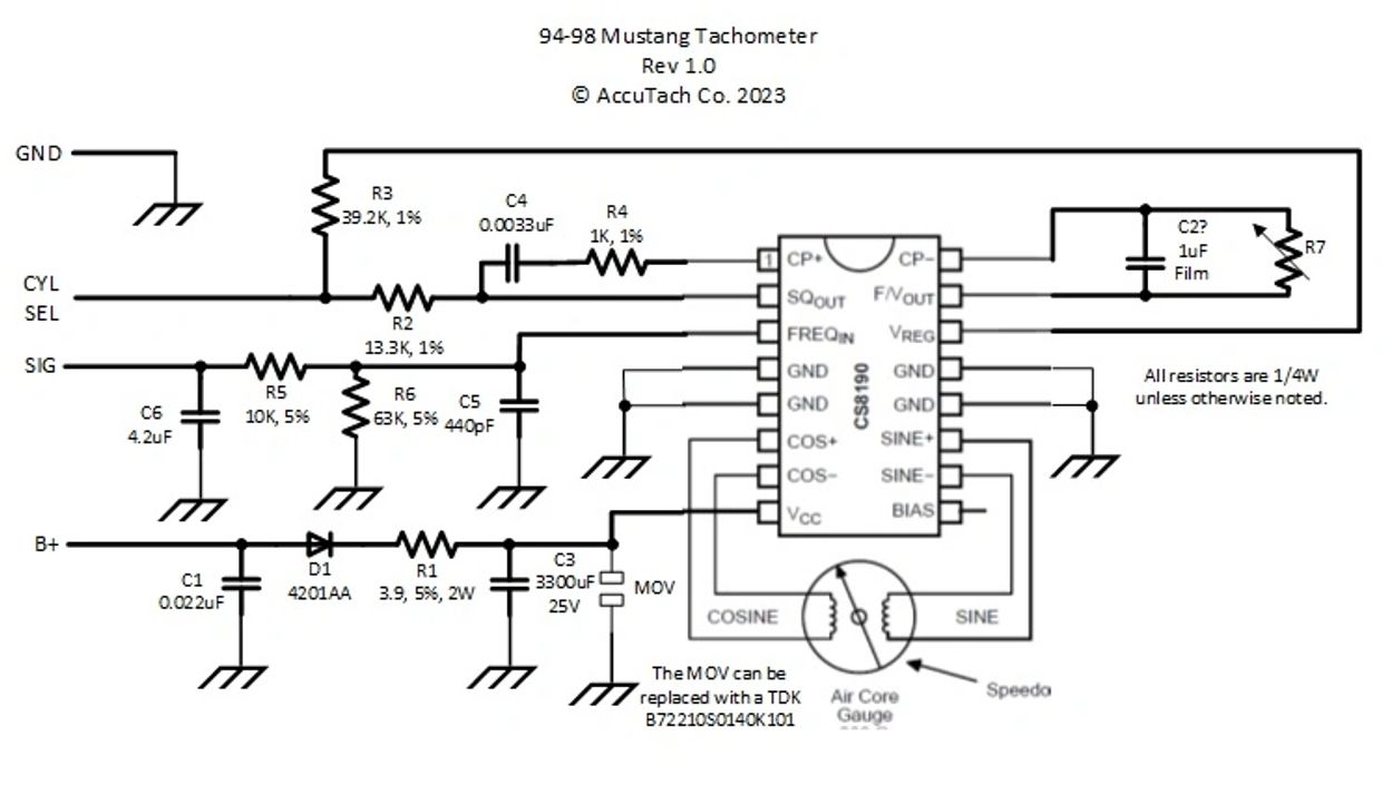 The heart of the tachometer is a CS8190 Precision Air-Core Tach/Speedo Driver with Return to Zero integrated circuit. Here are the tachometer schematics: