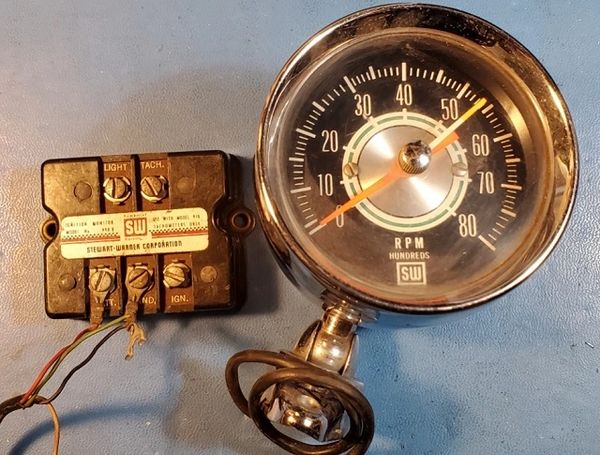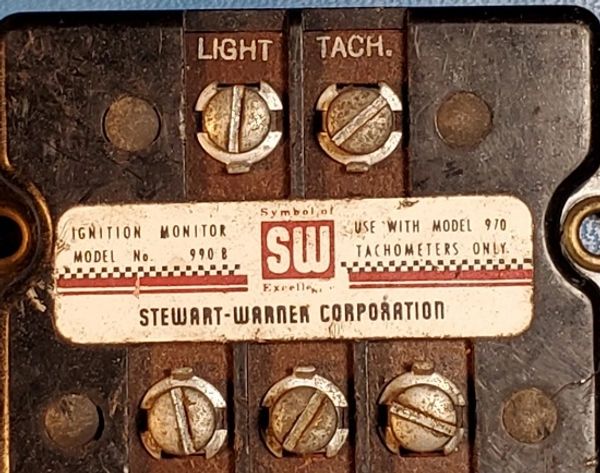 The Stewart Warner 970 Tachometer is mounted in a pod. It requires a Stewart Warner 990B Ignition Monitor that conditions the ignition signal to safely trigger the tachometer. If you are interested in the technical details of this tachometer, please read this reverse engineering document.