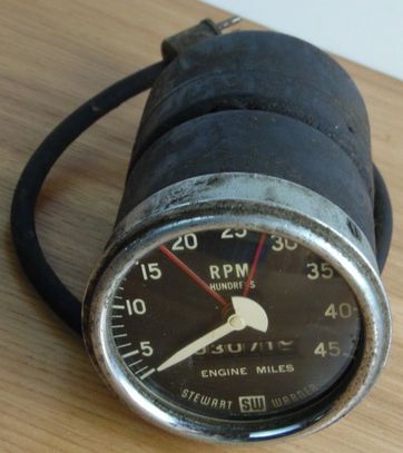 These tachometer monitors are actually mechanical speedometers calibrated for RPMs. The case looks like two cans bolted together. The front can is the speedometer and the rear can contains what we now call a stepper motor. (I had no idea that stepper motors had been invented that long ago.)