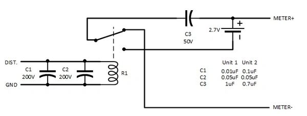 C1 and C2 probably provide some noise filtering as well as a little protection of the distributor points from back EMF from the relay. The SPDT relay flips back and forth with the closing and opening of the distributor points. When the relay connects the battery to the cap, the cap charges and when the relay connects the meter to the cap, the cap starts to discharge through the meter. The transmitter is calibrated by adjusting the tension on a spring in the relay.