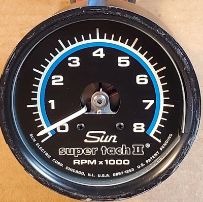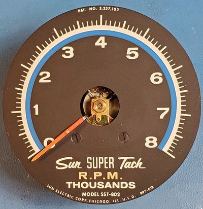 The Sun Super Tach is an electronic tachometer that does not need a transmitter. It reads the ignition signal from the negative side of the coil and displays the engine RPM on an ammeter calibrated in RPM. The electronics are packaged inside of the tachometer case.