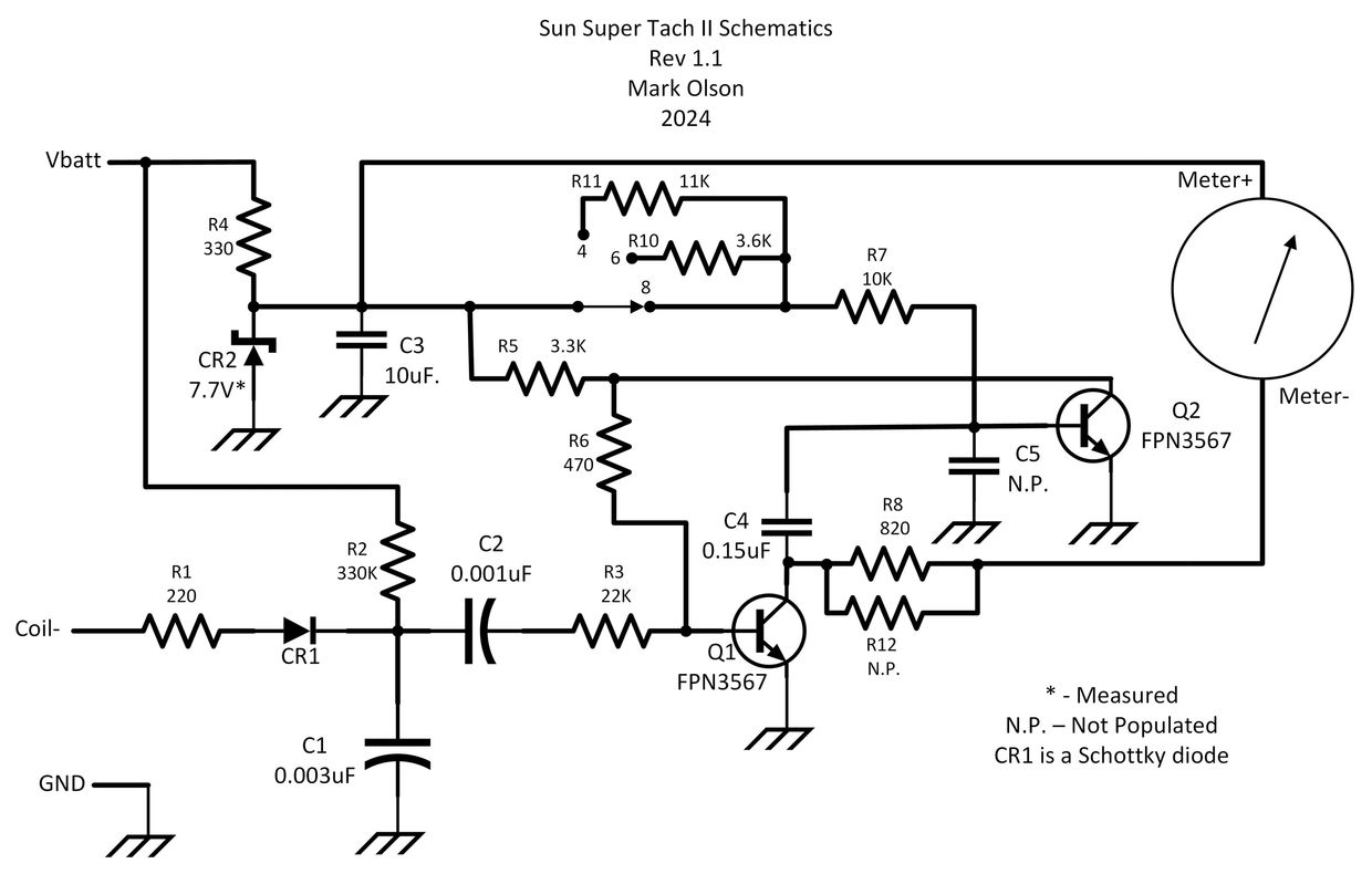 If anyone could put an ohmmeter across the meter of a working Super Tach II, I can add the resistance of the meter to complete the schematics.